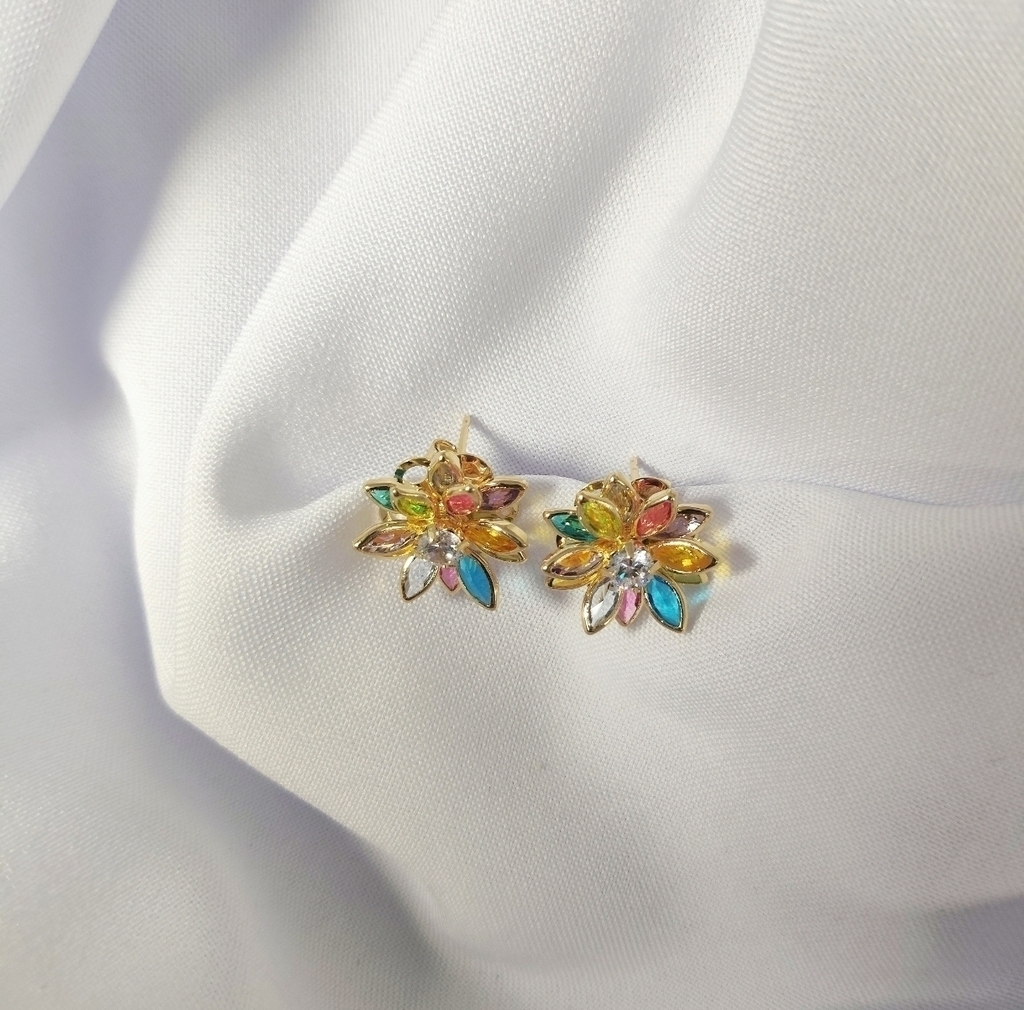 Com formato marcante e pedrinhas coloridas em destaque, esse brinco traz leveza e personalidade ao visual. Seu desenho floral com pontas definidas adiciona charme e originalidade à peça. Um acessório moderno que transforma até os looks mais simples com um toque especial.